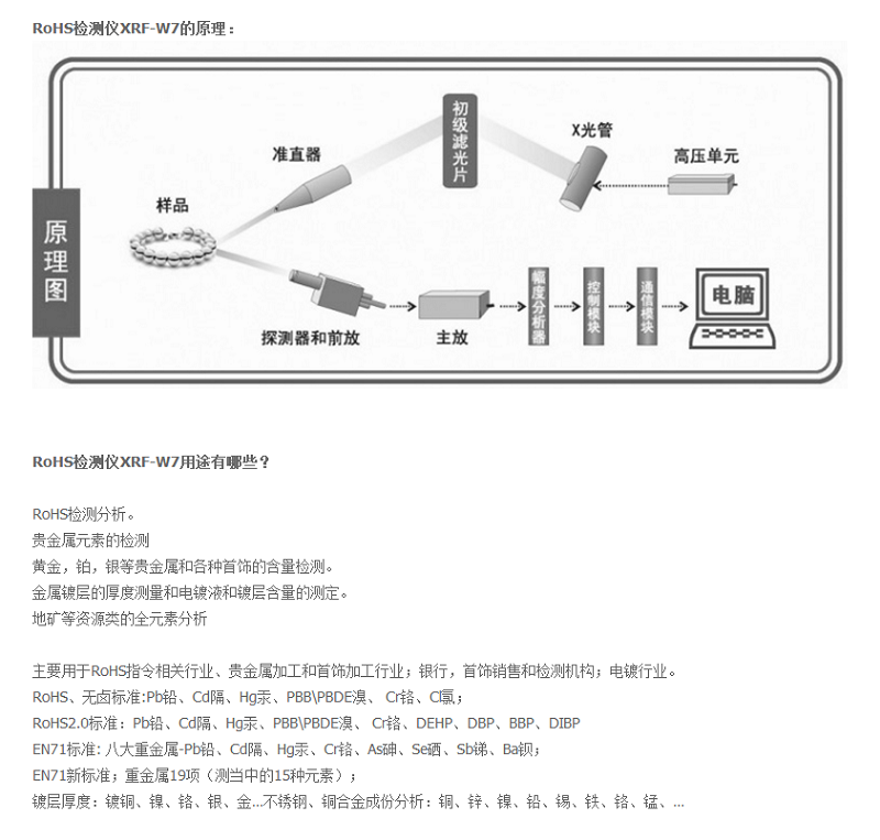 能量色散X熒光光譜儀簡(jiǎn)稱EDXRF,是一種物理的元素分析方法。近年來EDXRF主要作為一種快速檢測(cè)手段在電子、電器、珠寶、玩具、電鍍、建材、冶金、地礦、土壤、塑料、石油、化工、醫(yī)藥等行業(yè)發(fā)揮了很大的作用。XRF具有快速、無損、多種元素同時(shí)分析、分析成本低等特殊技術(shù)優(yōu)勢(shì)。