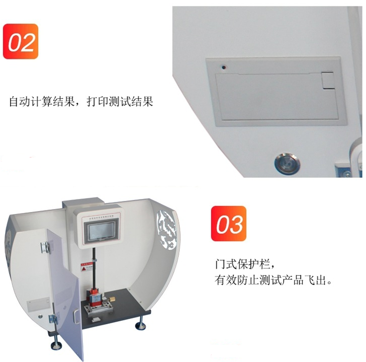 高精度智能控制器,并配備液晶顯示器,能直觀,準確的讀取數據國內使用碳纖維擺桿(已申請專利),在沖擊方向上,提高材料的剛性,及將沖擊質量集中在擺錘的質心上,真正做到無震動沖擊試驗,且使用壽命曾長。采用進口高分辨率的數字編碼器,角度測試精度更高更穩定符合空氣動力學原理的沖擊錘和進口滾珠軸承,減少了機械帶來的摩擦損耗自動計算最終結果,試驗數據可保存12組數據且求平均值可選擇中英文操作界面,測試結果可選擇J/m,KJ/㎡,kg-cm/cm,ft-ib/in等單位內置微型打印機打印測試數據。