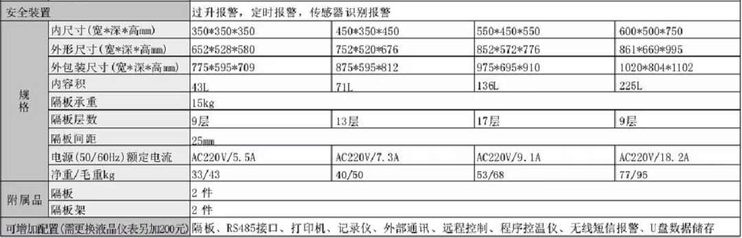 2.使用溫度范圍RT+10~250℃,溫度分布±2.5%,內容積43L、71L、136L、225L